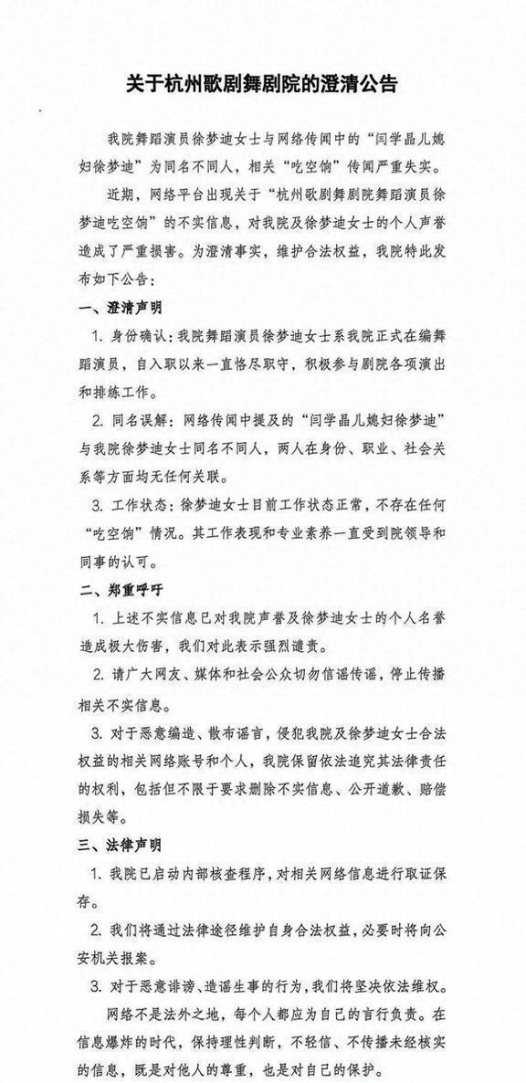 因为名字一样就被网暴,这无辜的演员真是成了流量的牺牲品,太不值了。眼瞅着这事儿越传越离谱,杭州歌剧舞剧院终于坐不住了,官方直接发了个澄清公告,话说得还挺严肃。这公告一发,大家伙儿都愣住了,没想到是这么个结果。原来啊,剧院里的这个“徐梦迪”,跟闫学晶的儿媳妇根本不是一个人。在剧院上班的那个徐梦迪,人家可是正经的优秀舞蹈演员,凭着十年实打实的功夫,一步步考进去的正式编制,那真是汗水摔八瓣换来的。至于闫学晶的儿媳妇,虽然也叫徐梦迪,但除了名字完全一样,俩人私底下一点儿关系都没有,八竿子打不着。